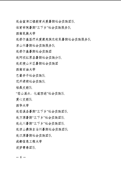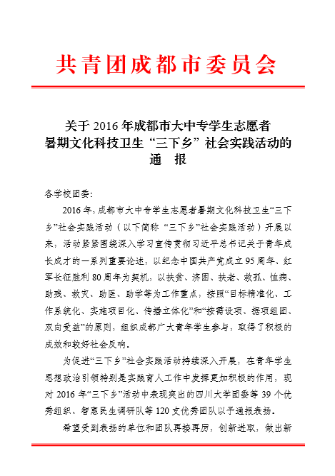 【本网讯】近日,共青团成都市委员会、成都市学生联合会下发了《关于2016年成都市大中专学生志愿者暑期文化科技卫生“三下乡”社会实践活动的通报》,我校团委荣获“2016年成都市大中专学生志愿者暑期‘三下乡’社会实践活动优秀组织奖”,我校“筑梦青春团队”、“气象防灾减灾宣传志愿者中国行成都队”、“朝阳小队”、“向日葵支教队”、“姚基金团队”等五支团队荣获“2016年成都市大中专学生志愿者暑期‘三下乡’社会实践活动优秀团队”称号。