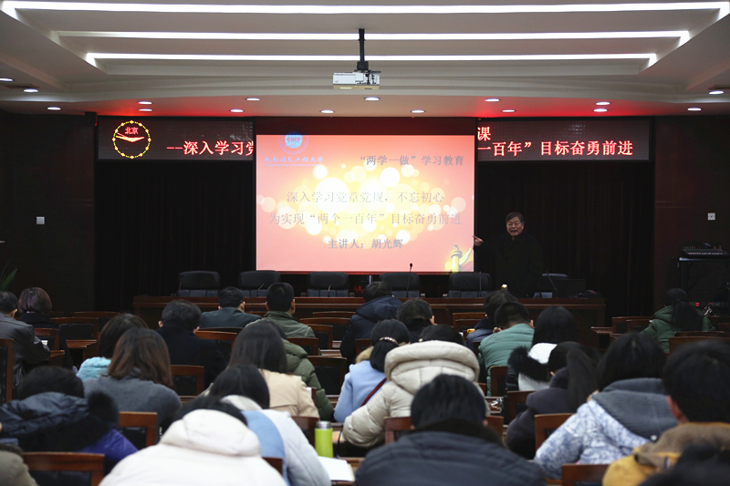 胡光辉以“深入学习党章党规,不忘初心,为实现‘两个一百年’奋斗目标奋勇前进”为题,结合个人体会和当前热点新闻事件,对十八届六中全会、全国高校思想政治工作会议以及全国科技创新大会的精神进行了解读和宣讲。胡光辉从讲述从严治党,加强党员监督,履行党员责任的重要意义入题,希望每一位教师党员通过“两学一做”学习教育,更加坚定理想信念,提高党性觉悟,增强政治意识、大局意识、核心意识、看齐意识,牢记对党和国家的责任;作为高校教师党员,必须做到在党爱党、在党言党、在党忧党、在党为党,按党的教育走好每一步,全方位、全过程、全身心投入到党的教育事业中,在教书育人中去体会幸福,在工作中发挥出党员教师的模范带头作用,努力达到习近平总书记在全国高校思想政治工作会议上提出的“围绕学生、关照学生、服务学生,不断提高学生思想水平、政治觉悟、道德品质、文化素养,让学生成为德才兼备、全面发展的人才”的要求。