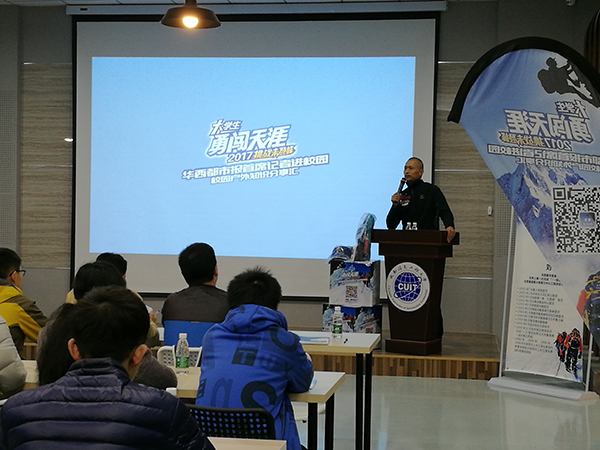 【本网讯】3月24日,学校青年志愿者协会在我校创新创业俱乐部举办了“校园户外知识分享汇——华西都市报首席记者进校园”活动。活动特邀华西都市报首席记者、国家级登山健将刘建作为主讲人,和在场的听众分享了他传奇的登山经历以及经历思考的感悟。