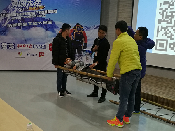 在正式演讲结束后,主持人主持了模拟户外受伤的现场活动,同学们热情参与其中,学习户外知识。很多同学表示听完讲座后学习到了很多有用的户外旅行知识,更学会了刘建身上不放弃勇探索的精神。