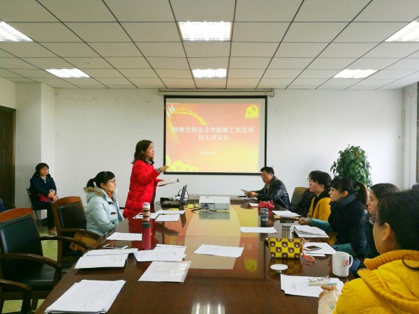【本网讯】为深入学习宣传贯彻党的十九大精神、进一步深入推进“两学一做”学习教育,根据学校党委关于开展民主评议党员工作的通知要求,1月11日上午,网络空间安全学院教工党支部在信息楼4楼三会议室召开了党员民主评议会。会议由教工支部书记王祖俪主持。