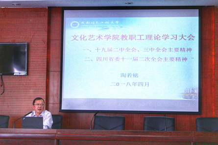 【本网讯】4月19日下午,文化艺术学院在龙泉校区1213会议室召开全院教职工理论学习大会,集中学习党的十九届二中、三中全会精神和省委十一届二次全会精神。会议由学院党总支书记陶若铭主持。
