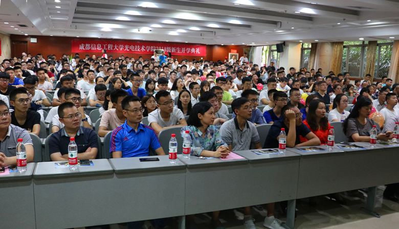 【本网讯】9月7日晚6点,光电技术学院在学术报告厅举行2018级新生开学典礼。党总支书记王嵩、副院长杨定宇、后备干部、科级干部、(副)系主任、专业教研室、实验室(副)主任、全体辅导员、2018级全体新生及部分家长代表参加了开学典礼。