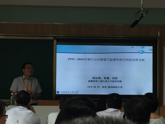 2018年8月28日至30日,靳立亚教授带队参加了在西安举办的2018年中国地理学大学,项目组成员主要参与了分会场中国南北过渡带的科学问题与研究的交流,程志刚副教授及硕士生陈笑笑分别做了《1975-2016年秦巴山区极端气温事件的空间差异性分析》和《秦巴山区不同等级降水变化特征分析》的口头报告,此外,硕士生王俊峰、吴秋洁还就最新研究成果进行了墙报交流。