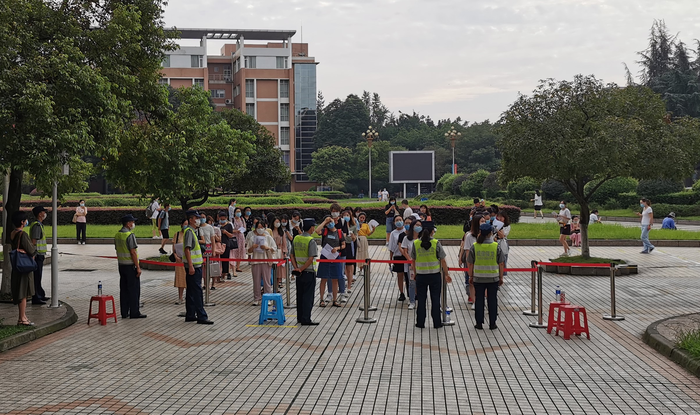 考试当天上午7:30,各考务工作组准备就绪,组织考生有序入场。所有考生进入考场前需查验证件、健康绿码、测量体温,落实疫情防控要求;考场内设置无线电信号屏蔽仪,保障考试安全;考务人员、监考老师认真核对考生信息,并采用金属探测仪检查违纪物品……考试于9:00准时开始,至11:00结束,考场秩序井然,圆满完成了考务、疫情防控等各项工作。