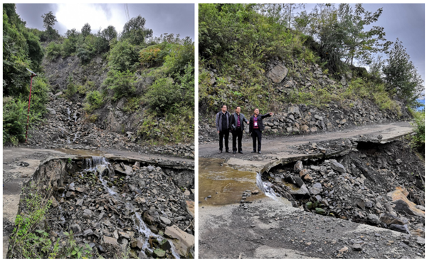 受今年雨水冲击损坏严重,该路段路面下过水管道堵塞,护坡坍塌,桥面大面积破损,已经部分悬空,无法通行,严重影响了村民的生产生活。培训会结束后,在学校驻村扶贫干部樊昌元教授和村干部的陪同下,王子华一行还实地考察村容村貌,重点查看了将建造的“成信桥”的位置地貌及受灾路段情况。