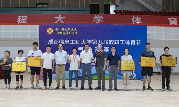 【本网讯】6月2日,学校第九届教职工体育节气排球比赛颁奖仪式在航空港校区体育馆举行。学校党委常委、副校长吴锡、体育部主任程艺、校工会委员会常务副主席周波、校团委副书记倪涛为获奖队伍颁奖。