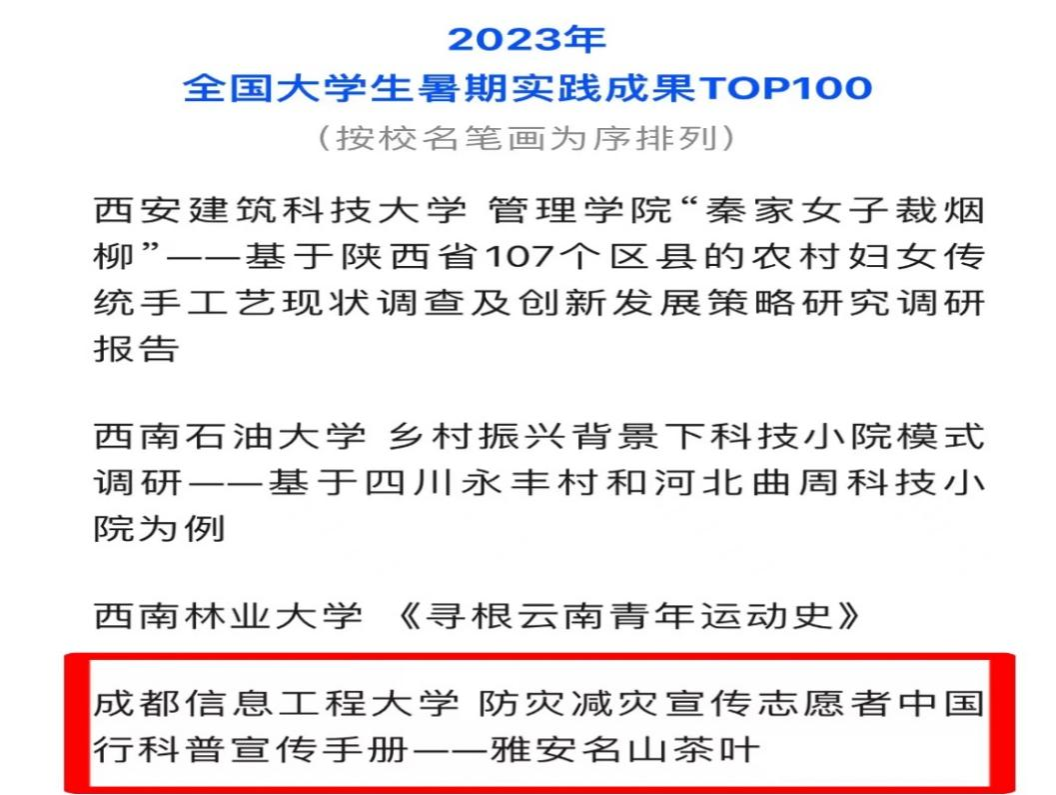 【本网讯】近日,中国青年报公布了2023年第九届全国大学生暑期实践展示活动获奖名单,三亿网防灾减灾宣传志愿者中国行科普宣传手册——雅安名山茶叶 入选全国大学生暑期实践成果TOP100。