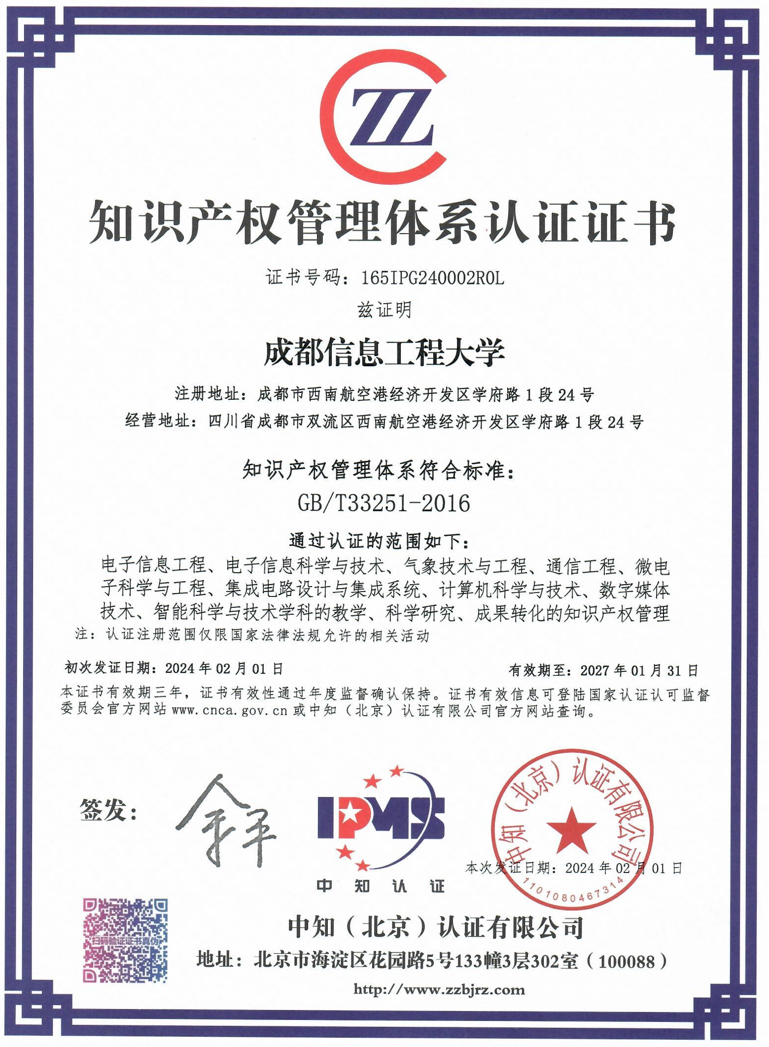 我校是四川省职务科技成果权属改革试点单位,将建设知识产权管理体系、申报国家知识产权试点高校等工作纳入科技创新事业规划的重要建设任务,坚持将知识产权工作融入科学研究、科教融合、成果转化全过程,构建了包括10个职能部门、涵盖电子信息等多个学科的知识产权管理运行体系,经过半年多的体系试运行,形成了符合国家标准并具有学校特色的知识产权制度体系和管理模式,为通过贯标认证奠定了坚实基础。