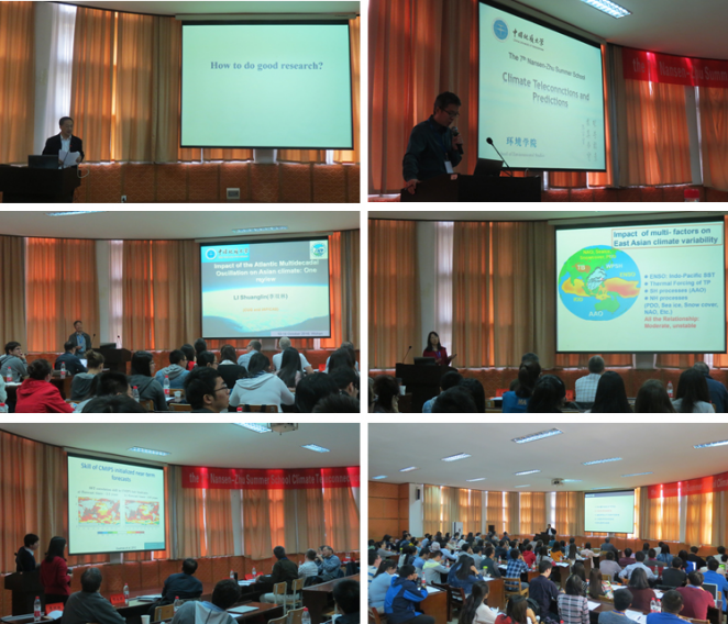 在为期五天的时间里,围绕此次讲习班的主题“Climate teleconnections and predictions”,来自中国和挪威的18位科学家就气候变化对雾霾的影响、东亚季风的年代际变化、南北半球环流的联系、古季风气候、北极涛动和北极海冰的气候效应、年代际气候变率、气候可预报性及气候预测等方面开展了内容丰富的专题报告。同时,来自中国和挪威的21名青年科学家和学生也围绕“气候遥相关与预测”这一主题做了研究报告,得到与会专家的点评和建议。我校大气科学学院9名研究生参加此讲习班,其中4名研究生代表汪家楠、程译萱、黄露、丁旭分别作了有关研究内容的英文主题汇报。
