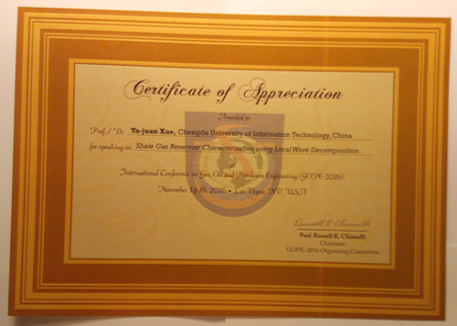 【本网讯】11月14日至16日,我校通信工程学院副教授薛雅娟博士应邀参加了“2016年天然气、石油和石油工程国际会议”(2016 International Conference on Gas, Oil and Petroleum Engineering,GOPE-2016),并作了题为“利用局部波分解方法进行页岩气储层描述”的主题报告,与众多学者和专家进行了讨论交流,研究成果在会上得到了很多研究者的关注和认可。