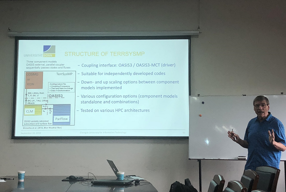 Simmer教授简要介绍了波恩大学的教学环境与教学特色,并为在坐师生分享了该校跨区域合作研究中心的工作进展。他对该中心搭建的陆面系统模拟平台的模拟机制等方面做了详细解释,通过数据分析,他指出,陆面系统模拟平台对不同区域的天气和气候模拟具有普适性,但也存在一定的系统性误差。