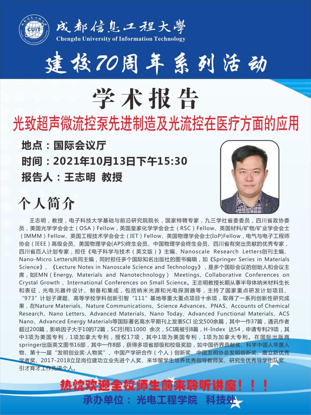 【建校70周年】王志明:光致超声微流控泵先进制造及光流控在医疗方面的应用