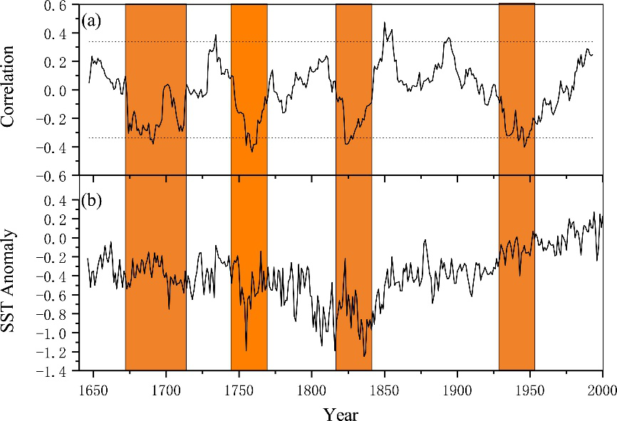 我国南北过段带西段scPDSI与ENSO指数的25年滑动相关性分析(1635~2005). (b)重建的热带印度洋(15°S~20°N, 40°~100°E)平均海表温度时间序列(1646~2001)。橙色矩形表示ENSO与区域湿度的显著负相关时段和热带印度洋海温的对应情况。虚线表示90%的置信水平。