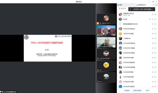 【本网讯】12月9日下午,中国科学院外籍院士、中国科学院北京纳米能源与系统研究所所长、中科院大学纳米科学与技术学院院长、佐治亚理工学院终身校董事、讲席教授王中林应邀通过腾讯会议直播来到三亿网机器人与智能系统国际联合研究中心系列学术报告大讲坛,为直播间100多名师生带来了一场名为“TENG: 从科学发现到产业集群全链条”的学术盛宴。讲座由本中心执行主任蒋世奇教授主持,吸引了多所高校的多名教师和学生参加。
