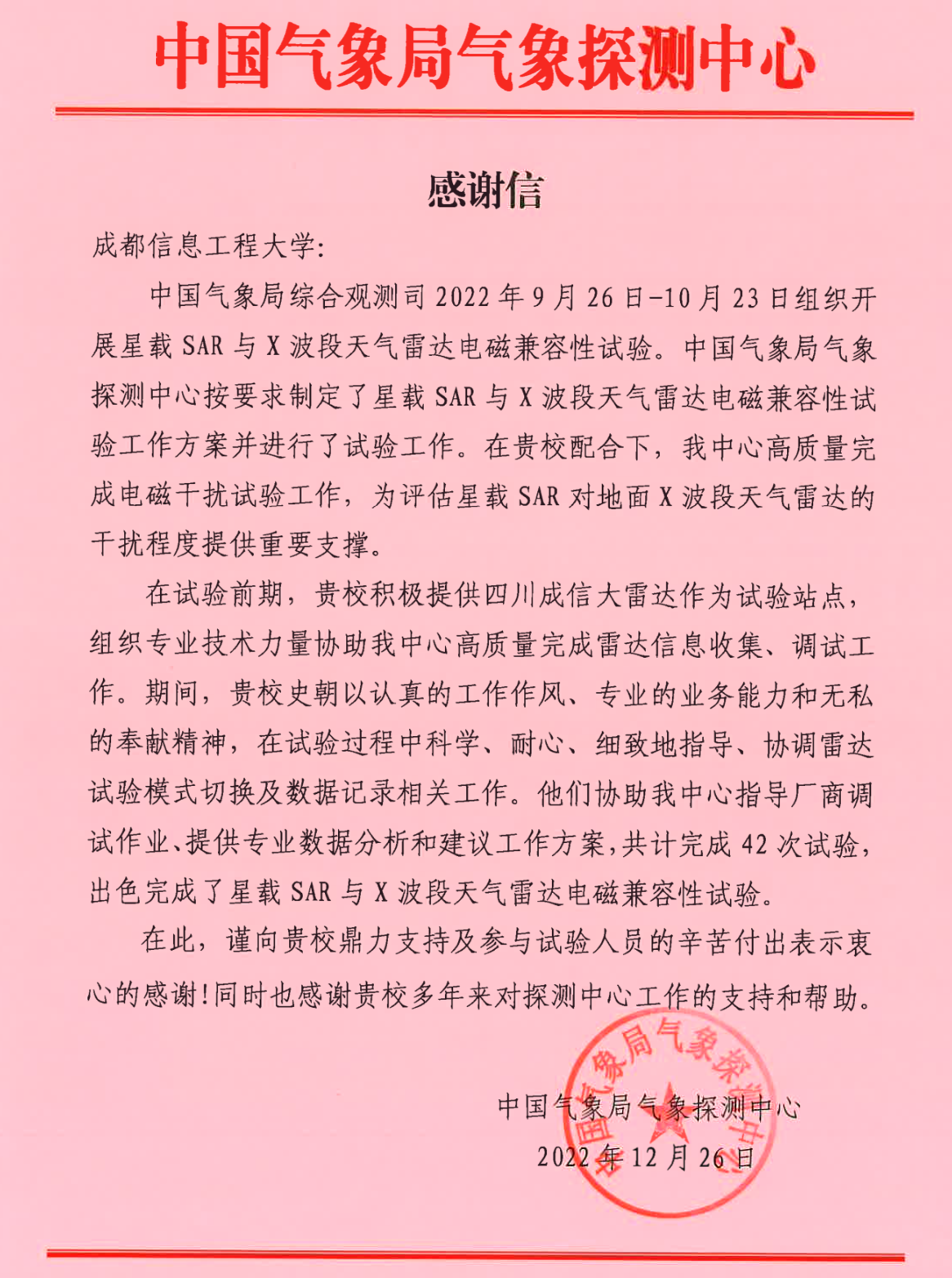 【本网讯】近日,我校收到中国气象局气象探测中心发来的一封感谢信,就我校电子工程学院副院长史朝协助工作、出色完成星载SAR与X波段天气雷达电磁兼容性试验表示感谢。感谢信详细内容如下: