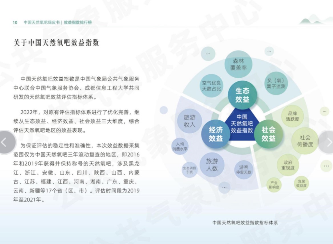 此外,2022年的氧吧效益指数评价结果也被中国气象局公共气象服务在首次发布的《中国天然氧吧评价公报(2022年)》中采纳应用。