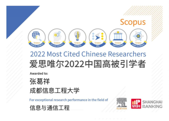 我校自动化学院张葛祥教授再次入选爱思唯尔(Elsevier)中国高被引学者榜单和世界排名前2%科学家名单(World's Top 2% Scientists)