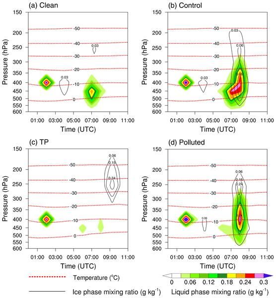 图1.区域A(31.4-31.5N,92.0-92.1E)平均液相和冰相水凝物混合比的垂直分布时间序列图:(a)干净,(b)控制,(c)青藏高原和(d)污染情景,虚线为等温线。