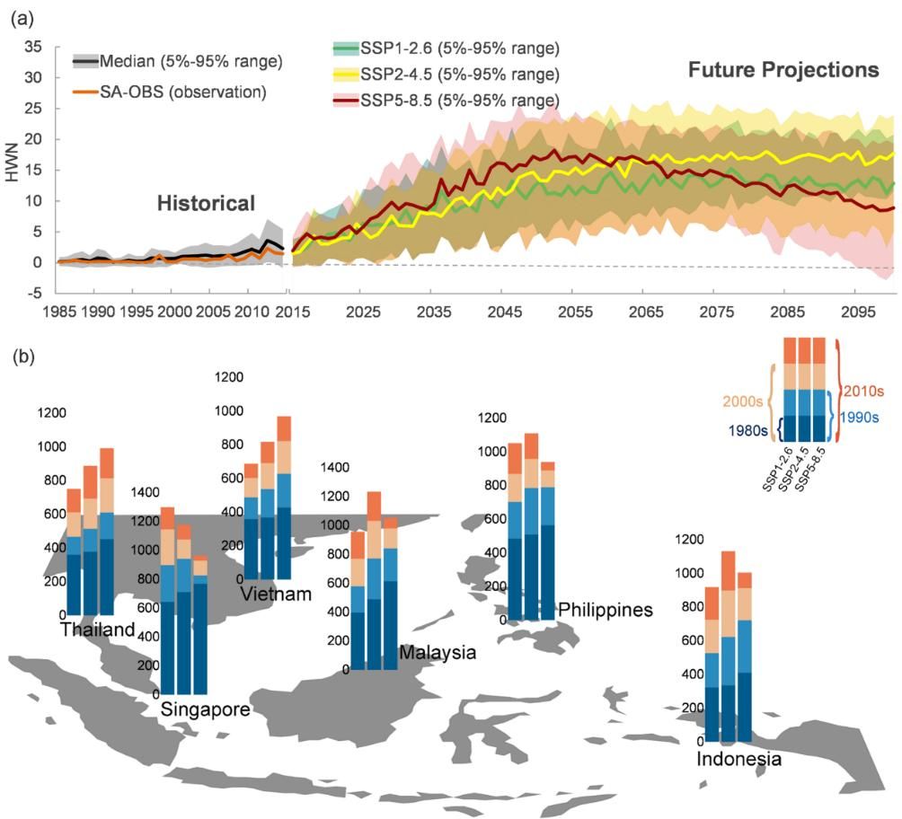图(a) 1985–2100年东南亚地区复合型热浪事件的年平均次数。(b)未来SSPs情景下,东南亚国家1980年代、1990年代、2000年代和2010年代的出生人群预计一生中经历的复合型热浪事件次数。