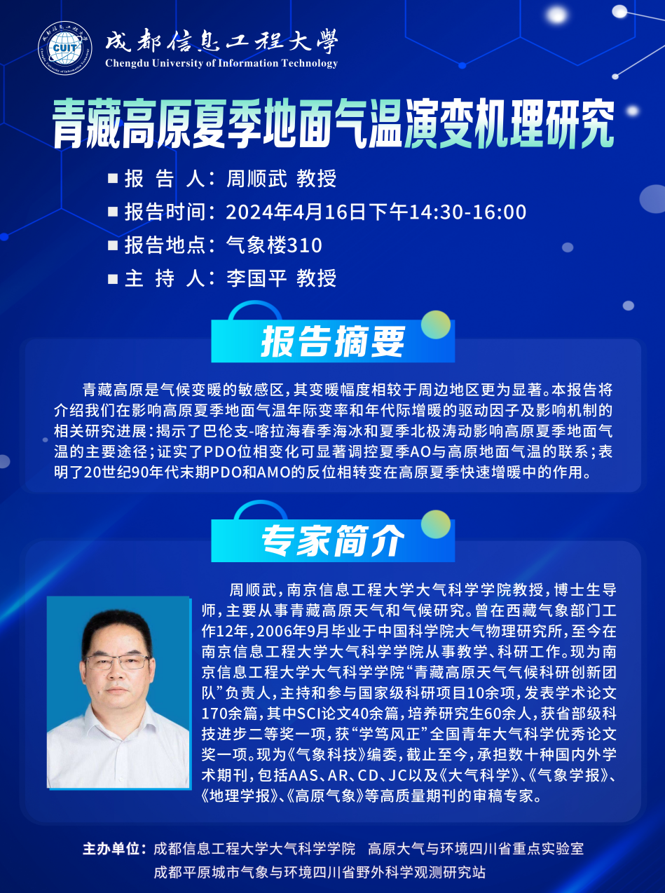 【学术讲座预告】青藏高原夏季地面气温演变机理研究