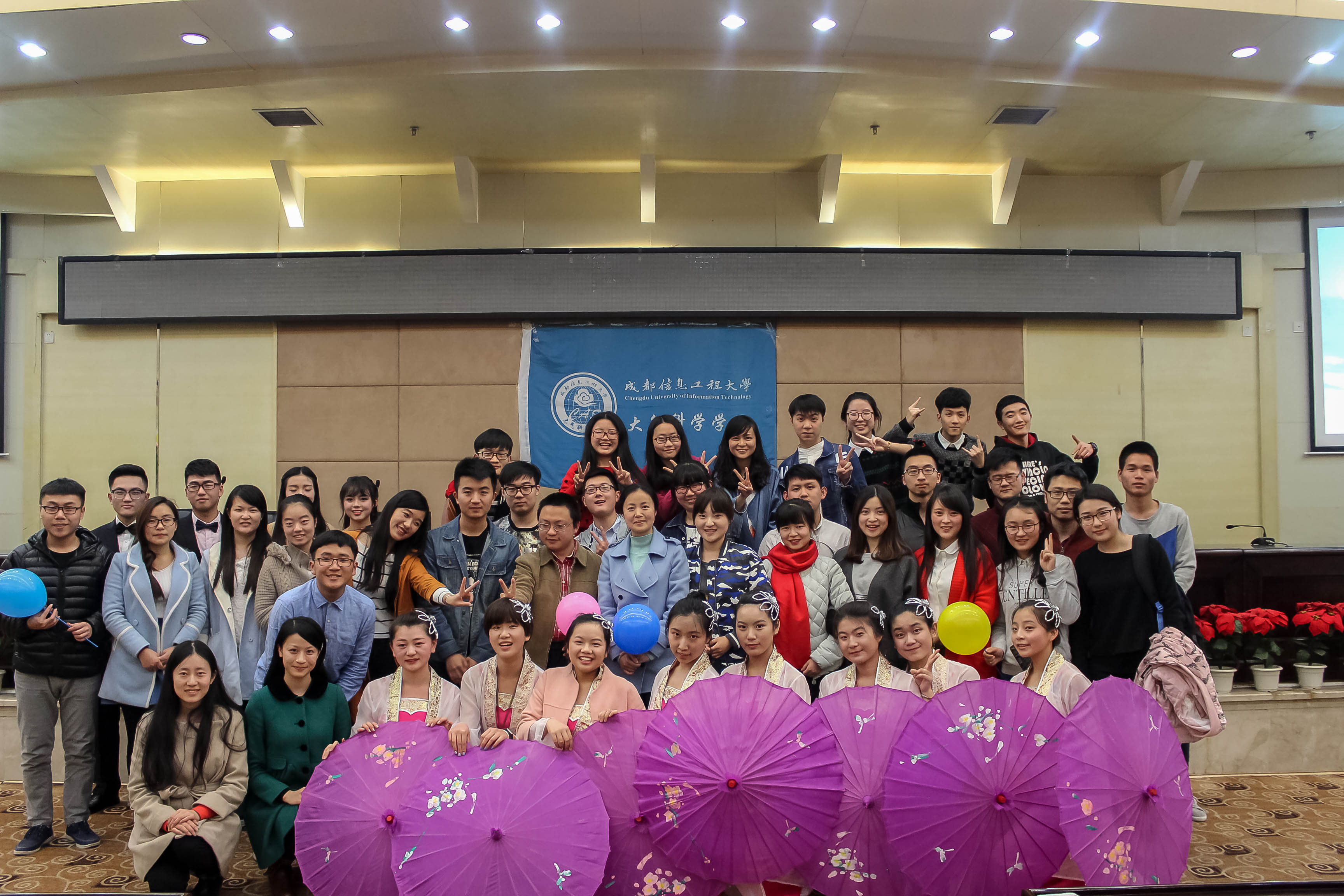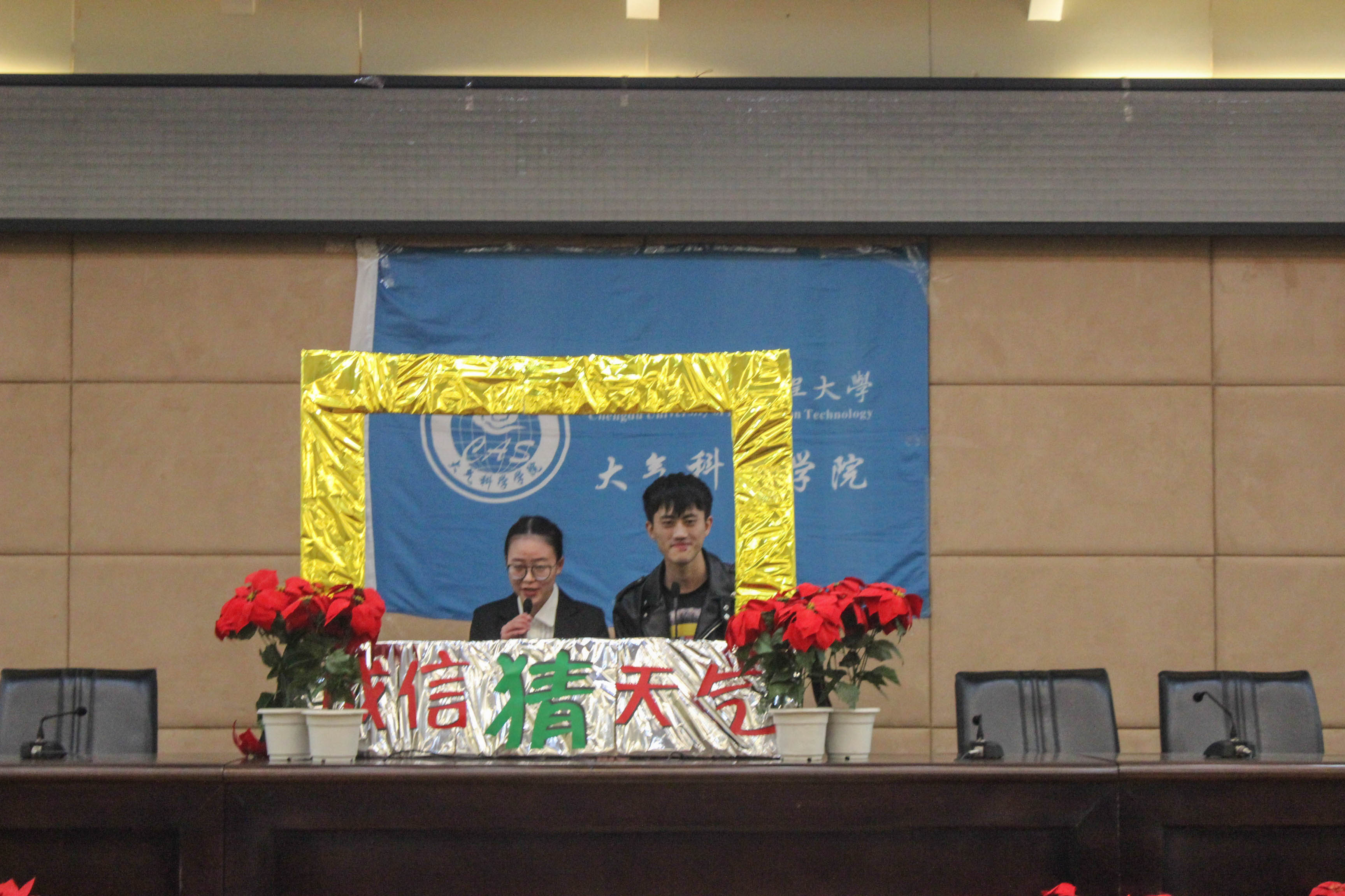 伴随着街舞社的开场舞,晚会正式拉开帷幕。首先开始的节目是“成信版”天气预报,表演者用生动有趣的四川话来为我们播报天气预报,欢快的笑声在晚会现场此起彼伏。紧接着是气象百科知识竞赛的决赛,经过前两轮的初赛、半决赛的角逐,共有4支队伍进入本次决赛。最终,在选手们的沉着冷静的作答中,来自大气141班的符美映小组获得了本次气象百科知识竞赛的冠军。随后,来自向日葵剧社的话剧《气象观测员的除夕夜》为我们讲述了气象工作者的艰辛和勤奋。除此之外,晚会还进行了“寻找最美气象”的颁奖和播放了来自四川省气象局、西南空管局校友的视频祝福。