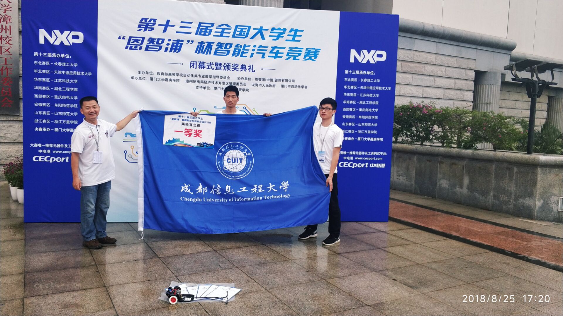我校选手从去年底招新,经过智能车四川省省赛、西部赛等激烈角逐,我校的参赛选手获得了多个西部赛和四川省赛一等奖的奖励。最后,穆天增、向科治、李卓参加了8月22至8月26日在厦门大学嘉庚学院体育馆举行的第十三届全国大学生“恩智浦”杯智能汽车竞赛全国总决赛。经过紧张激烈的比赛,他们克服种种不利因素,获电磁直立组全国一等奖,获全国第9名,同时又报名参加了只有进入全国总决赛队伍才能进行的挑战赛——更激烈的室外马路挑战赛,赛车冒雨并完美地完成了比赛,获室外马路挑战组全国二等奖。