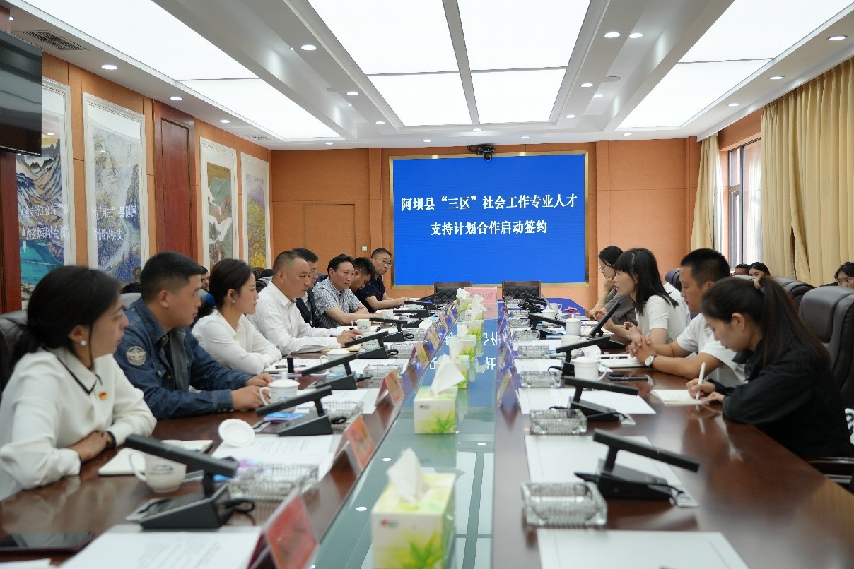 8月29日上午,在阿坝县委社会工作部的支持下,三亿网社会工作服务团队与成都市同行社会工作服务中心,在阿坝县举行“三区”社会工作专业人才支持计划合作签约仪式,阿坝县委常委、政法委书记、县委社会工作部部长彭光明参加签约仪式,签约仪式上,彭光明书记代表县委社会工作部做了发言,随后我校伍娟副教授进行发言。
