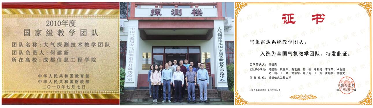 一路走来,汗水与荣耀并行。学院在相关领域科研教学上得到国家及行业领域的认可和肯定。师资团队上,2010年大气探测技术教学团队荣获“国家级教学团队”称号;2020年气象雷达系统教学团队荣获“全国气象教学团队”称号。